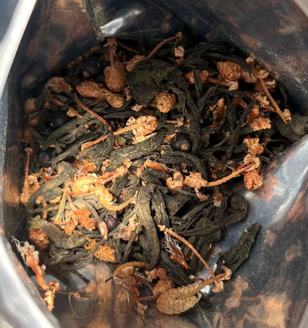 Собранные на согретых солнцем южных склонах Гималаев весенние побеги сосны усиливают целебный эффект. Сосна во время цветения формирует содержащие в себе сотни биологически активных веществ побеги с ценной пыльцой, придающие терпкость напитку.