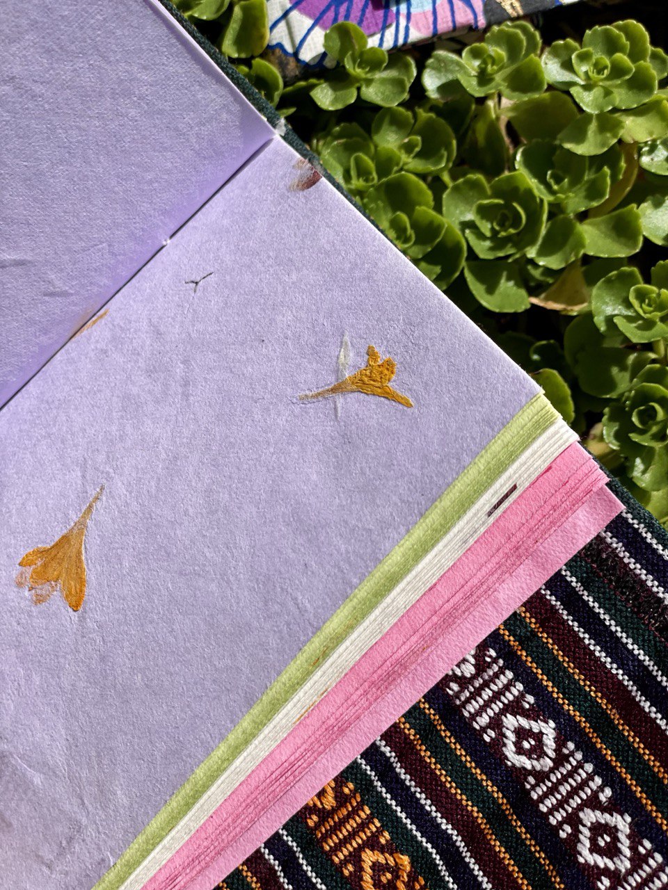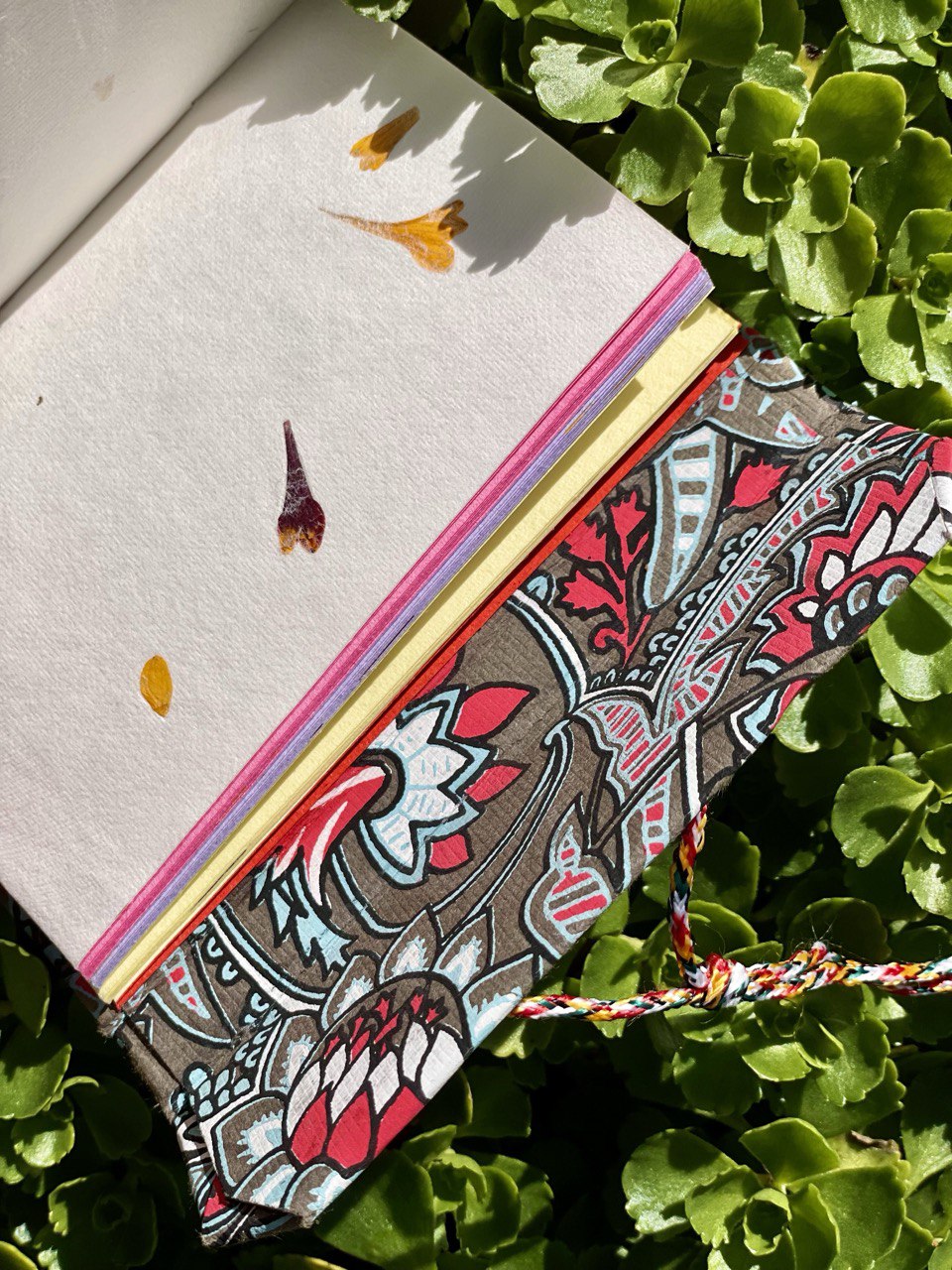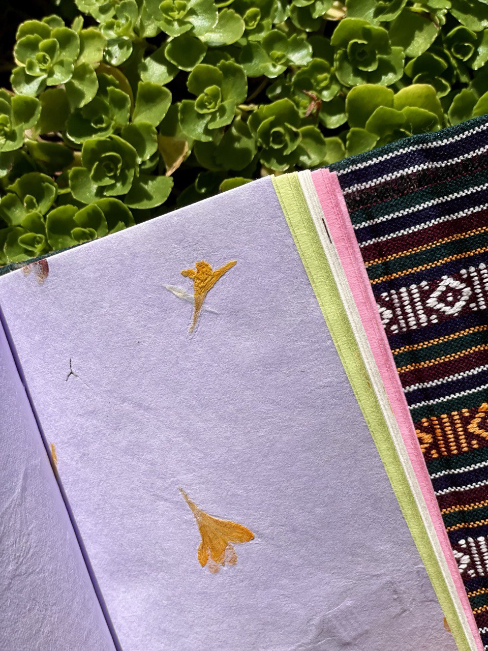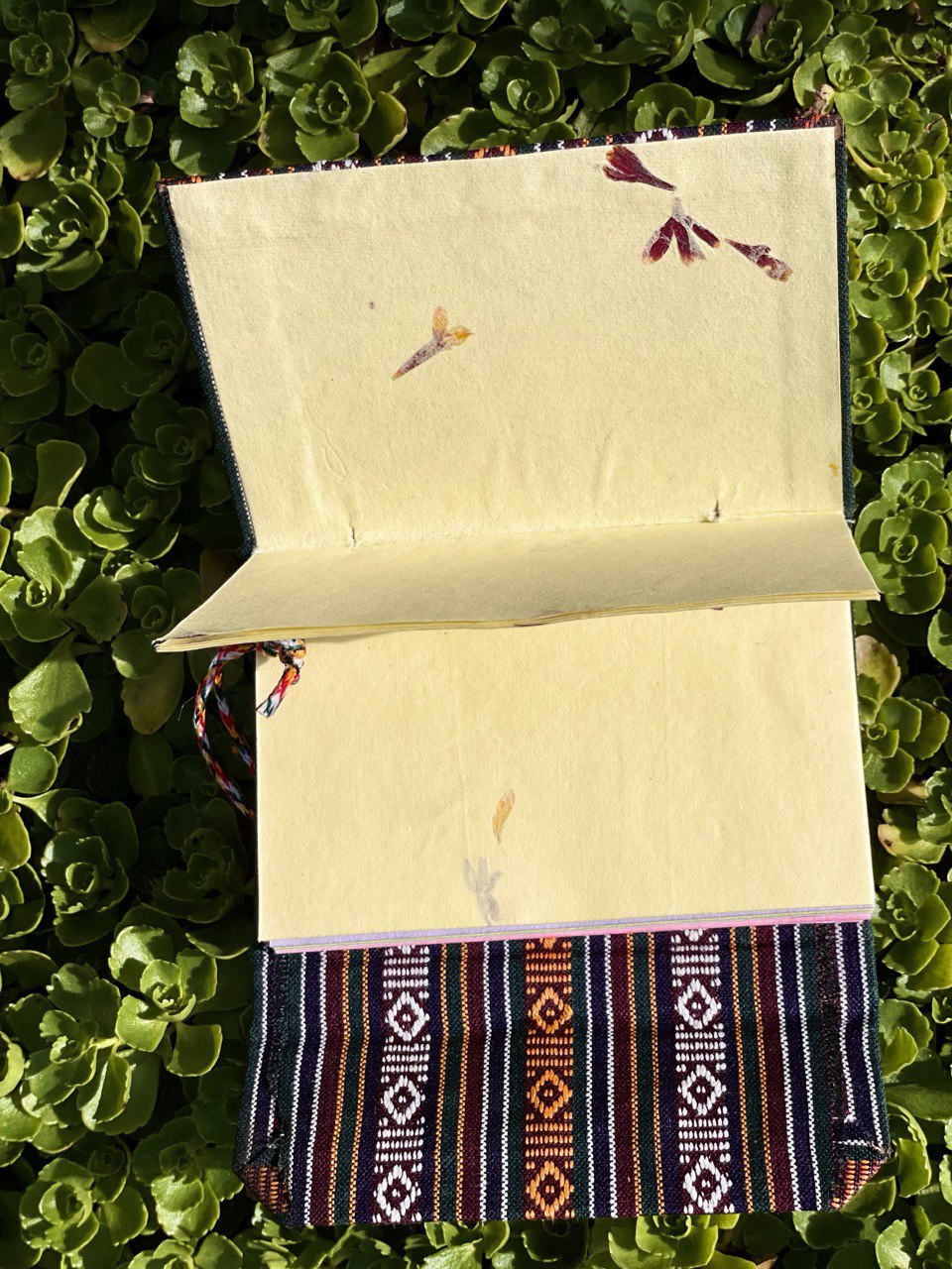 Изготовленные вручную тибетцами из Индии блокноты с цветами на цветных страницах из фактурной бумаги. Твёрдая, обёрнутая тканью с тибетскими орнаментами обложка закрывается веревочкой с ракушкой.