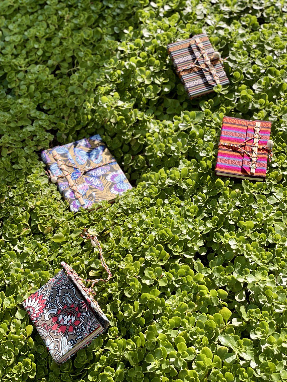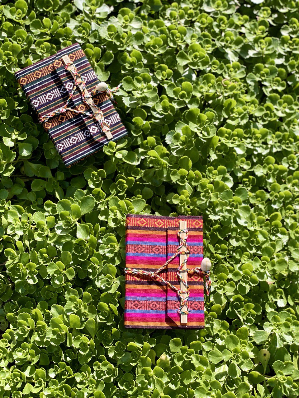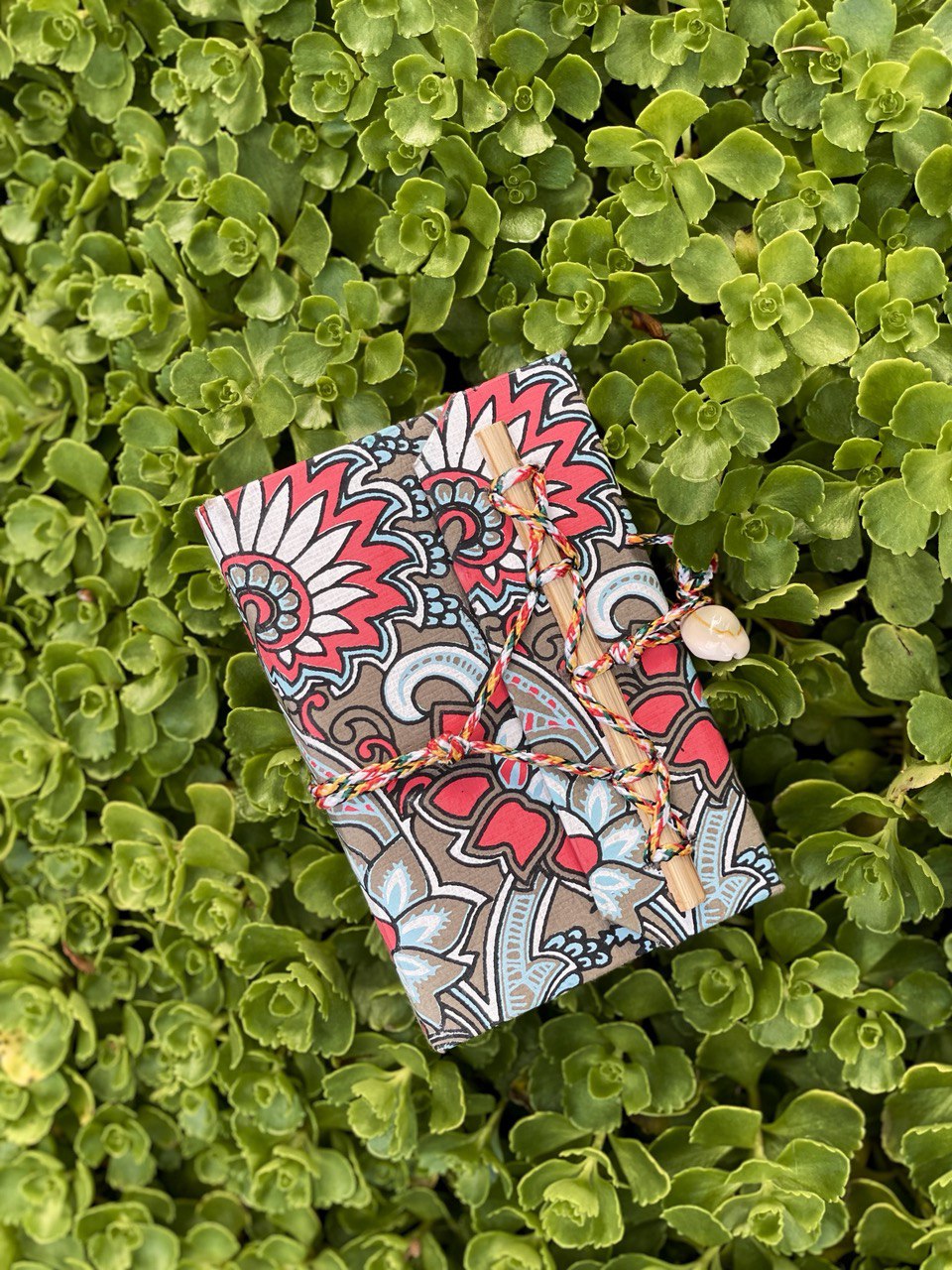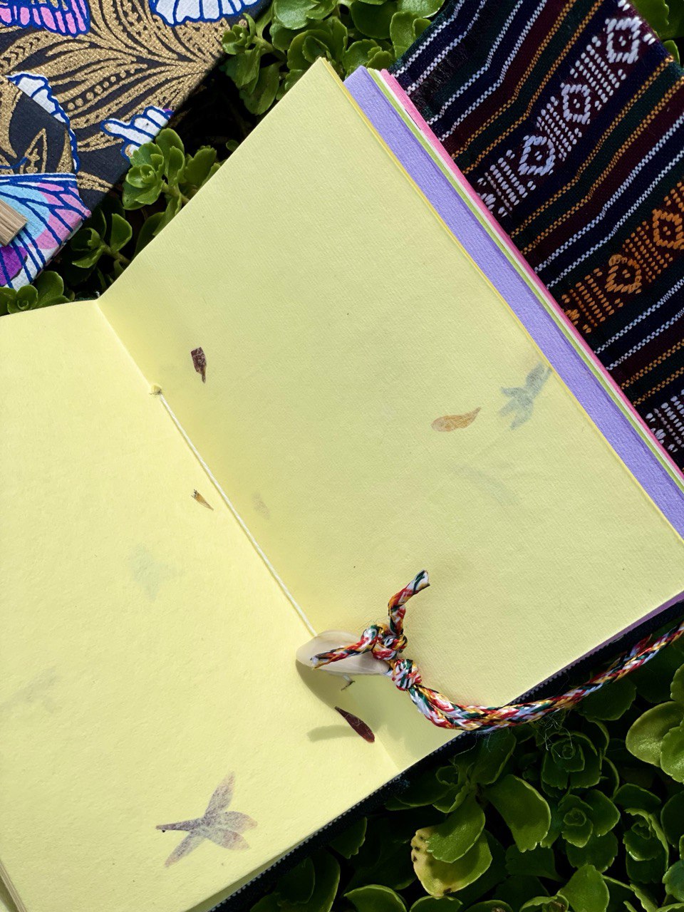 Изготовленные вручную тибетцами из Индии блокноты с цветами на цветных страницах из фактурной бумаги. Твёрдая, обёрнутая тканью с тибетскими орнаментами обложка закрывается веревочкой с ракушкой.