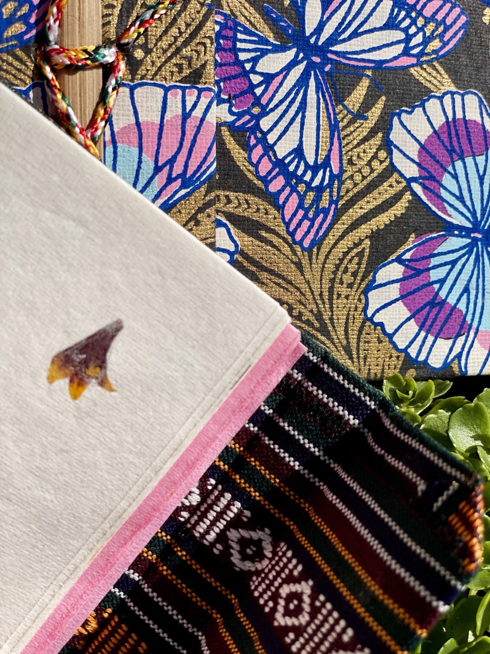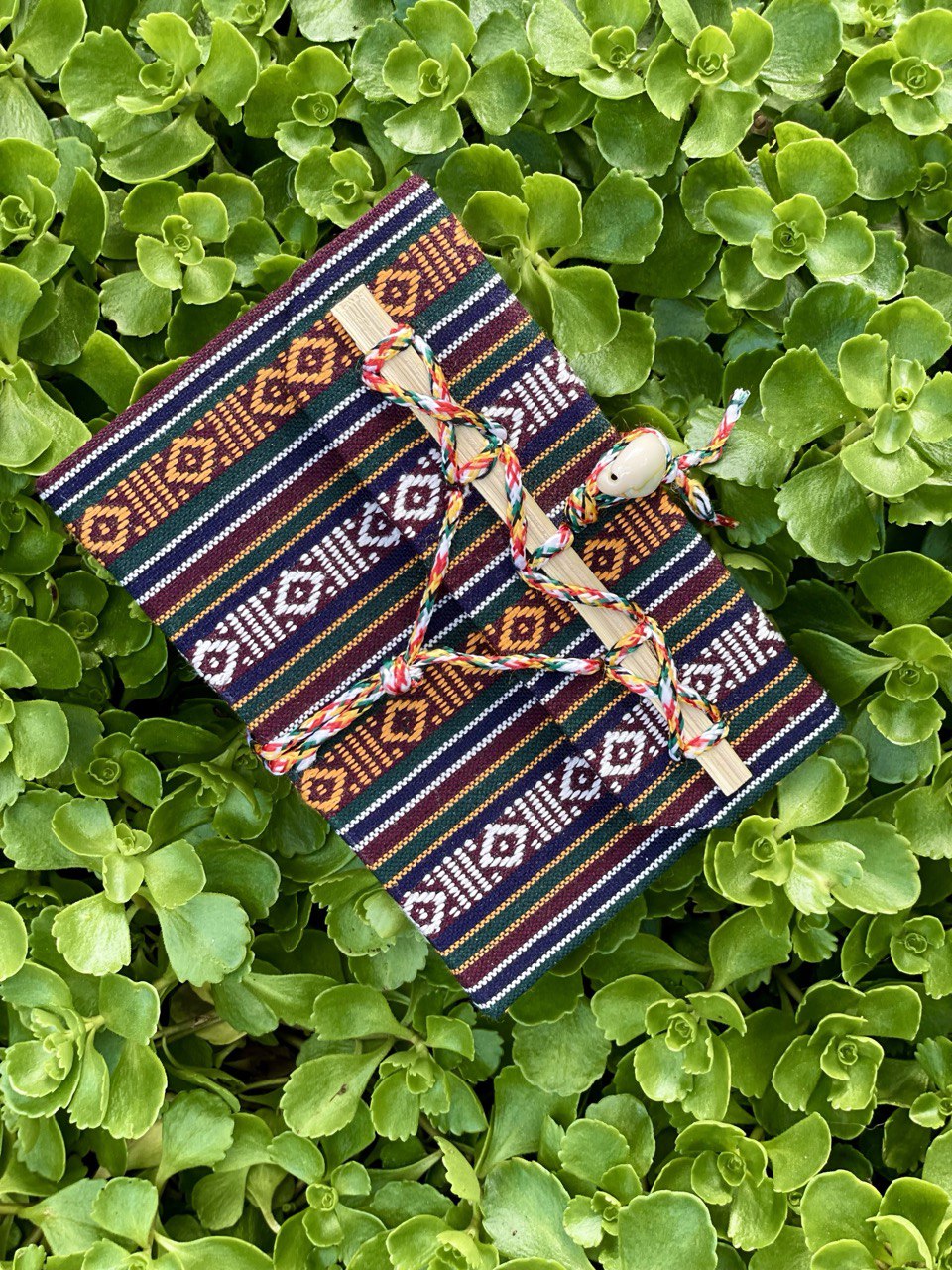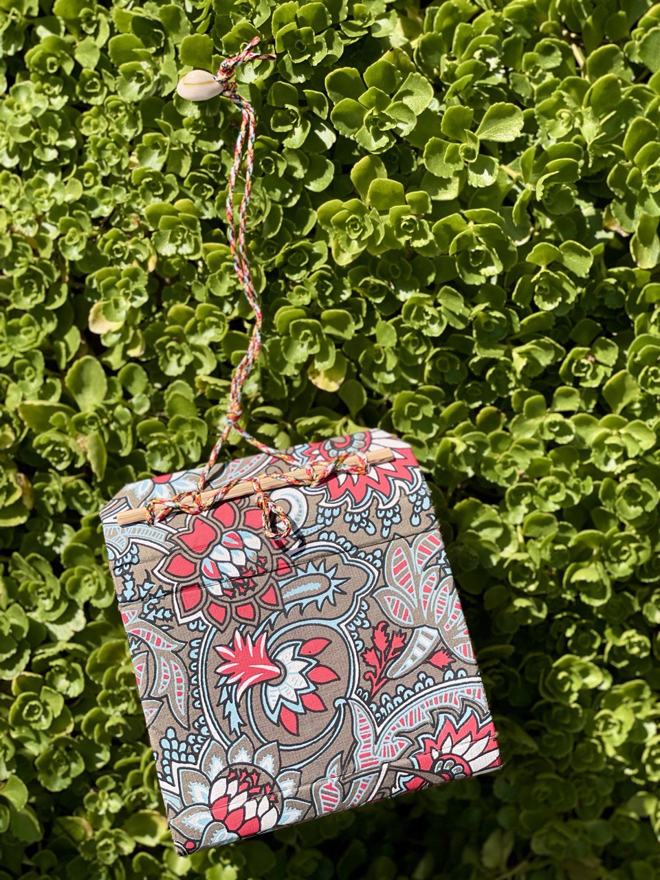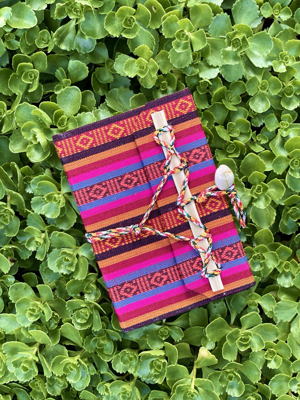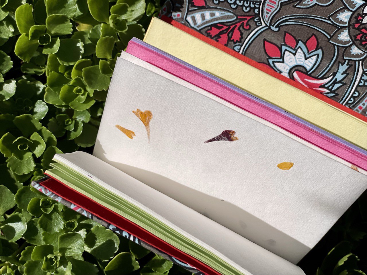 Изготовленные вручную тибетцами из Индии блокноты с цветами на цветных страницах из фактурной бумаги. Твёрдая, обёрнутая тканью с тибетскими орнаментами обложка закрывается веревочкой с ракушкой.