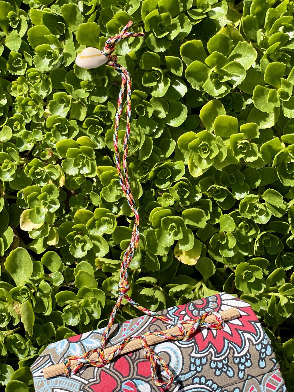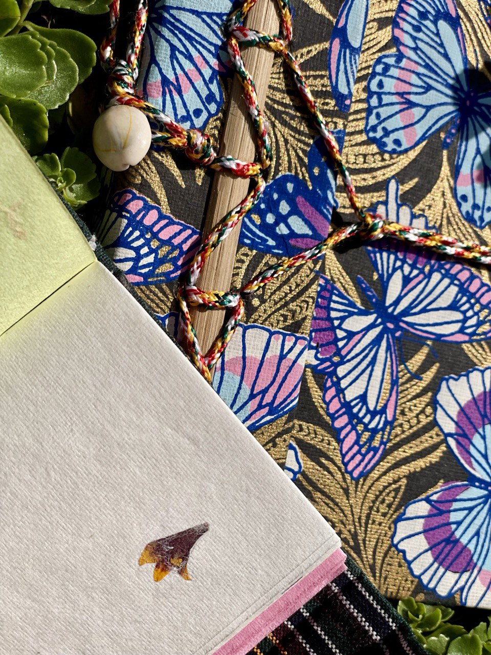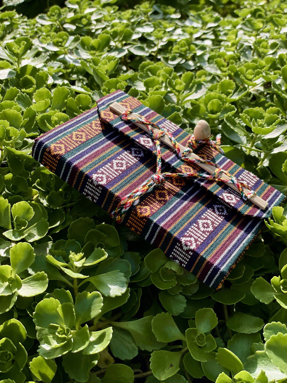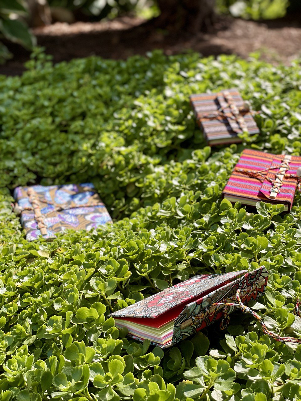 Изготовленные вручную тибетцами из Индии блокноты с цветами на цветных страницах из фактурной бумаги. Твёрдая, обёрнутая тканью с тибетскими орнаментами обложка закрывается веревочкой с ракушкой.
